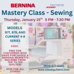 Congratulations on the ownership of your new bernette or BERNINA machine. By taking this sewing mastery class for models b77, b79, and current 4-8 series, you will learn to care for your machine and how to use specialty functions to customize your machine's settings to your needs. You'll learn to use the most important utility stitches on your machine, such as straight stitches, overlock stitches, long stitches, blind hem, and buttonholes. In addition, you'll learn about the many creative options of your machine, including decorative stitches, combi mode, free-motion stitching, and more. NOTE: If you purchased your bernette or BERNINA machine from the Tilted Quilters, there is no cost to you. Contact the shop at (904) 677-4160 to enroll, otherwise, you can enroll online to pay for the course.