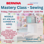 Congratulations on the ownership of your new bernette or BERNINA machine. By taking this sewing mastery class for models b77, b79, and current 4-8 series, you will learn to care for your machine and how to use specialty functions to customize your machine's settings to your needs. You'll learn to use the most important utility stitches on your machine, such as straight stitches, overlock stitches, long stitches, blind hem, and buttonholes. In addition, you'll learn about the many creative options of your machine, including decorative stitches, combi mode, free-motion stitching, and more. NOTE: If you purchased your bernette or BERNINA machine from the Tilted Quilters, there is no cost to you. Contact the shop at (904) 677-4160 to enroll, otherwise, you can enroll online to pay for the course.